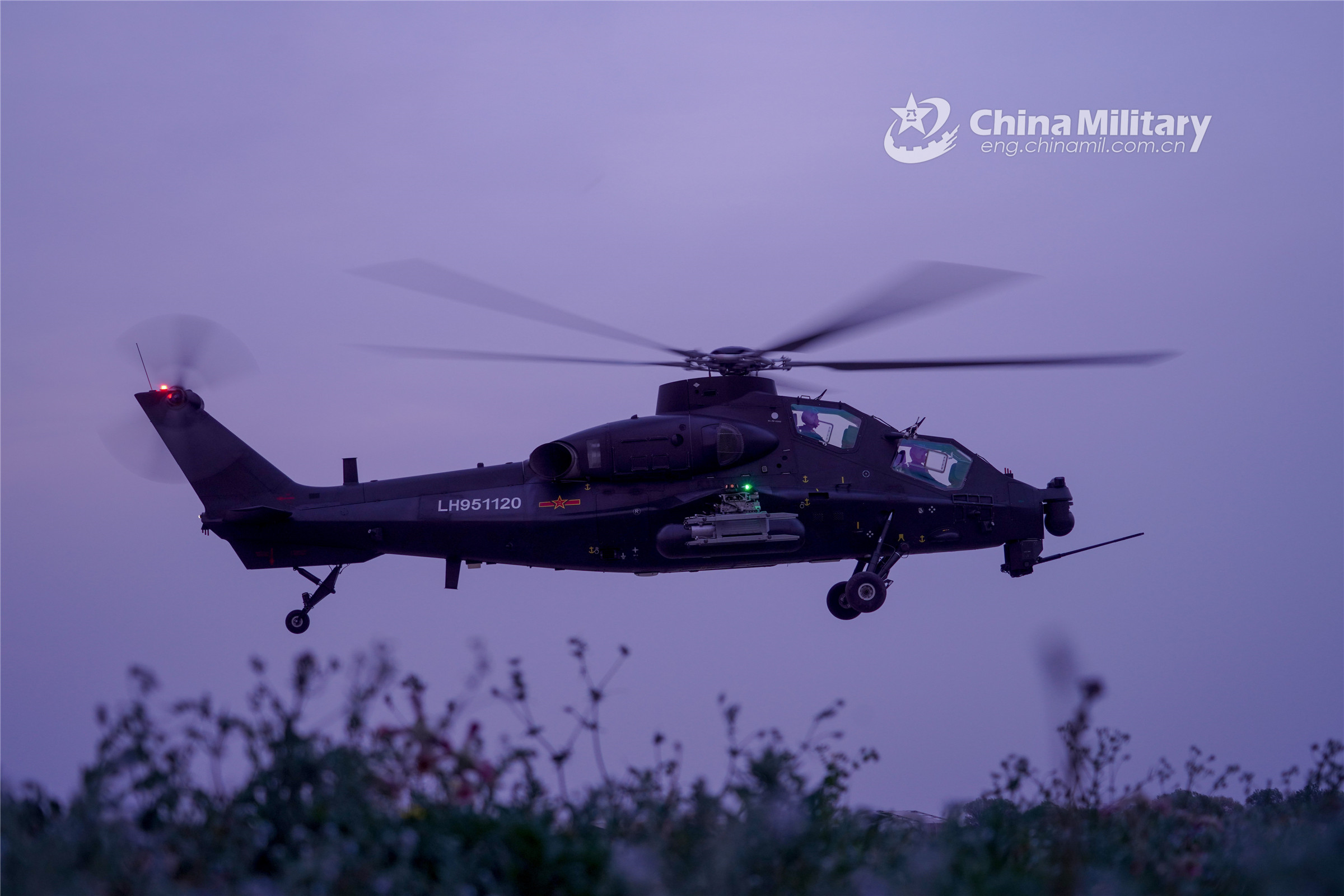 A helicopter attached to an aviation brigade under the PLA 81st Group Army conducts nighttime flight training during a round-the-clock flight training exercise on April 20, 2022. (eng.chinamil.com.cn/Photo by Luan Cheng)
