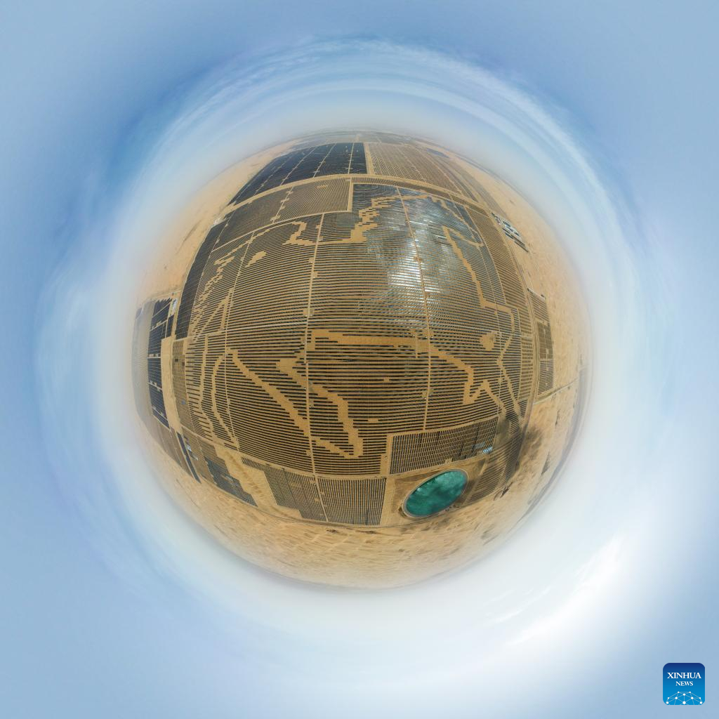 Aerial panoramic photo taken on April 21, 2022 shows the Dalad Photovoltaic Power Base in Dalad Banner, north China's Inner Mongolia Autonomous Region. (Xinhua/Liu Lei)