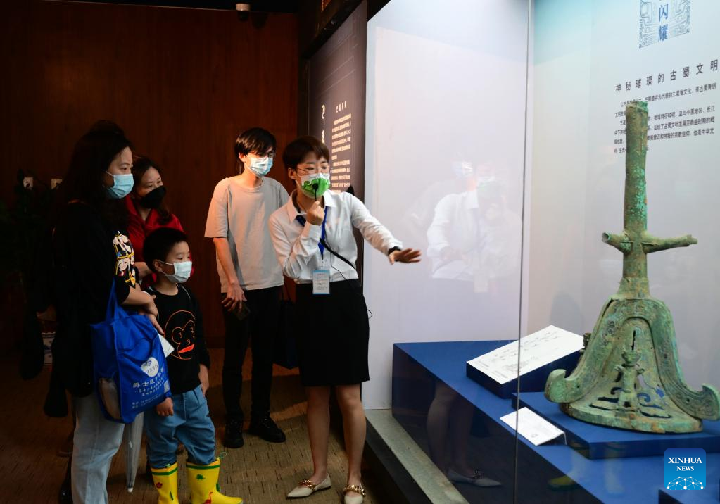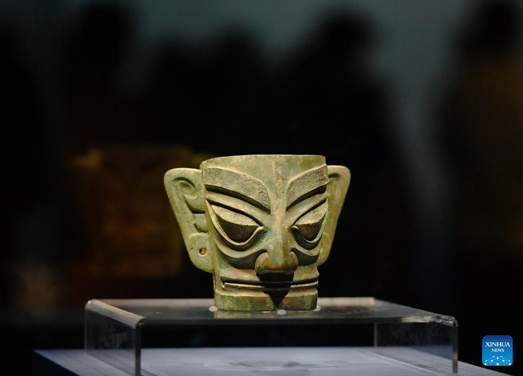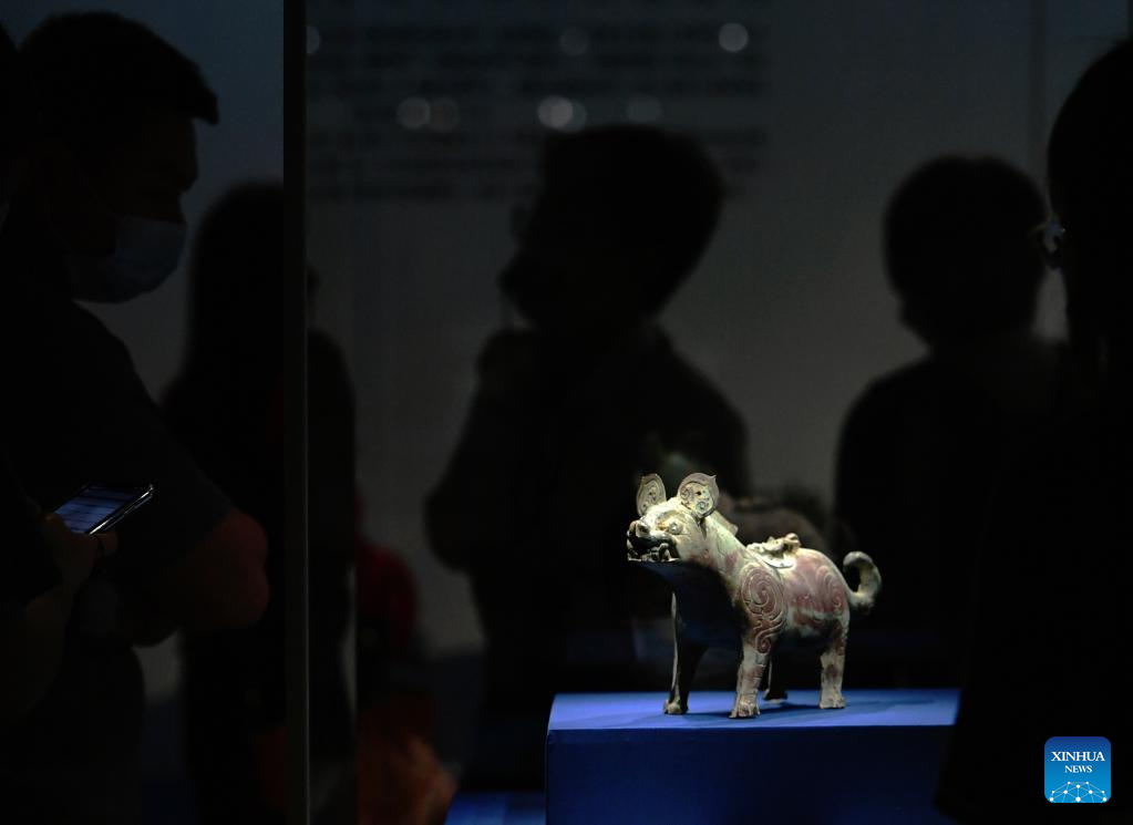 An exhibit is displayed at an exhibition named "Share the Same River: Bronze Age Civilization in the Yangtze River Valley" at Fujian Museum in Fuzhou City, southeast China's Fujian Province, May 12, 2022. (Xinhua/Wei Peiquan)