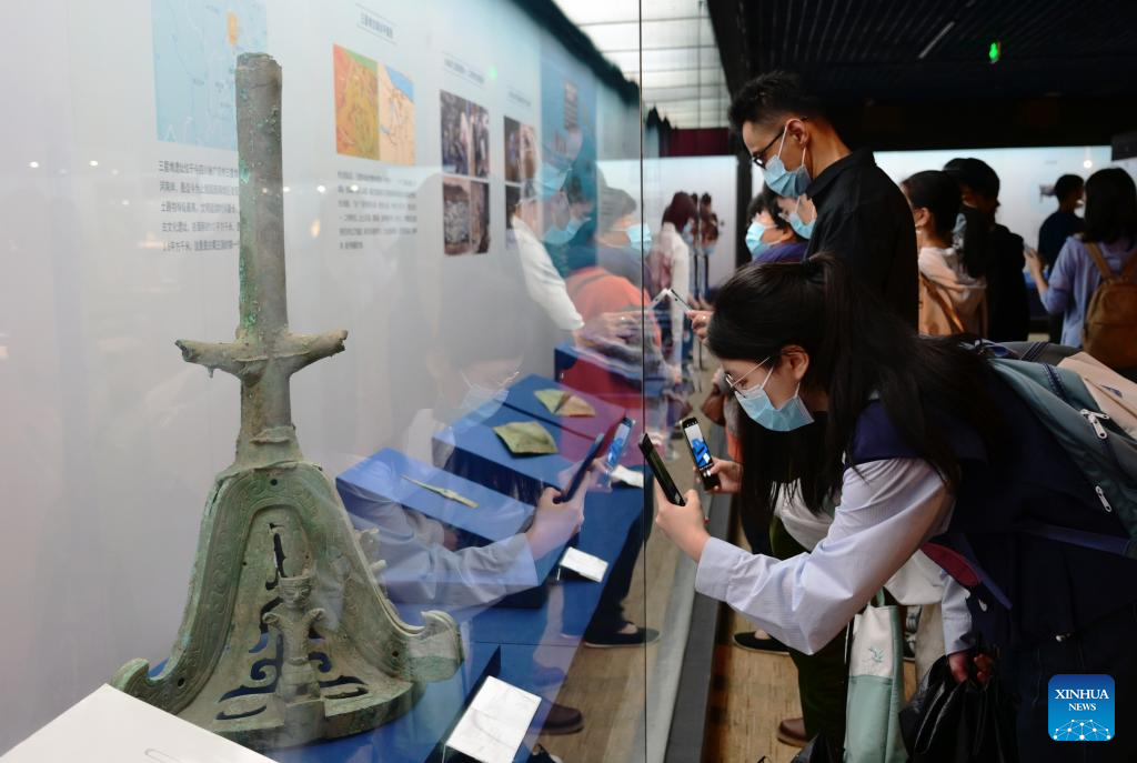 Visitors take photos of exhibits at an exhibition named "Share the Same River: Bronze Age Civilization in the Yangtze River Valley" at Fujian Museum in Fuzhou City, southeast China's Fujian Province, May 12, 2022. (Xinhua/Wei Peiquan)