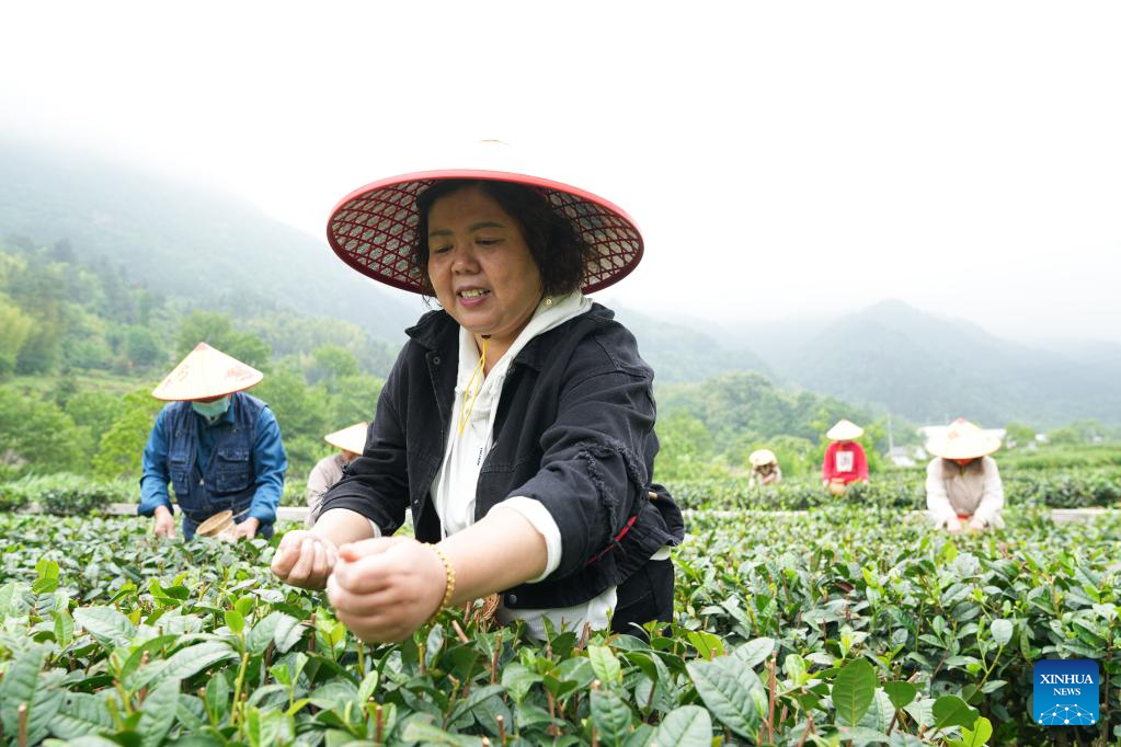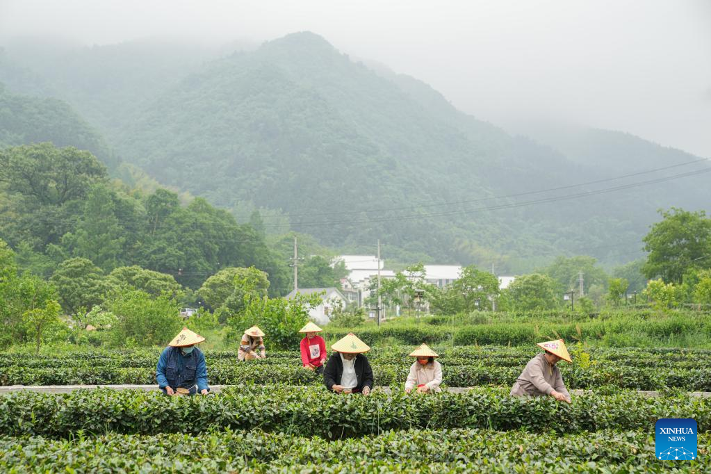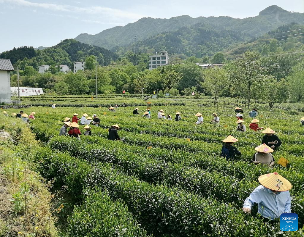 Villagers pick tea leaves at a tea garden in Dawan Village of Jinzhai County, east China's Anhui Province, May 11, 2022. Located in the deep of Dabieshan Mountain region, Jinzhai County is a famous tea planting and production base. During the past years, the county has been actively promoting industrial integration and agro-tourism to boost local people's income. (Xinhua/Du Yu)