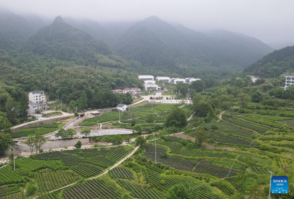 Aerial photo taken on May 11, 2022 shows a tea garden in Dawan Village of Jinzhai County, east China's Anhui Province. Located in the deep of Dabieshan Mountain region, Jinzhai County is a famous tea planting and production base. During the past years, the county has been actively promoting industrial integration and agro-tourism to boost local people's income. (Xinhua/Du Yu)
