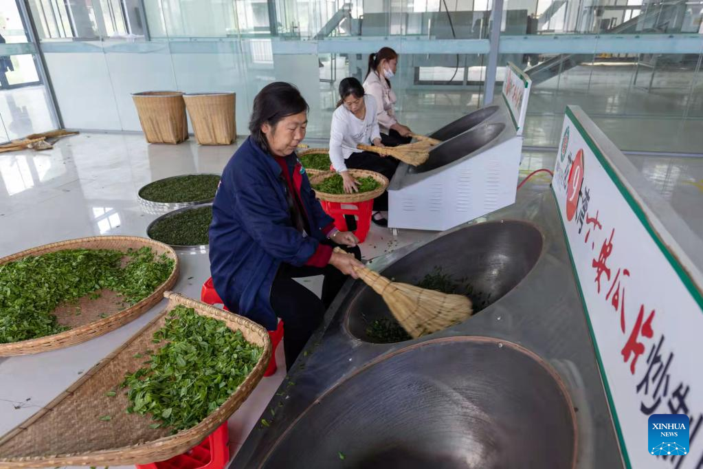 Workers bake tea leaves in Dawan Village of Jinzhai County, east China's Anhui Province, April 19, 2022. Located in the deep of Dabieshan Mountain region, Jinzhai County is a famous tea planting and production base. During the past years, the county has been actively promoting industrial integration and agro-tourism to boost local people's income. (Photo by Wang Cheng/Xinhua)