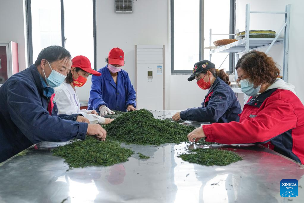 Workers sort tea leaves at a workshop in Dawan Village of Jinzhai County, east China's Anhui Province, May 11, 2022. Located in the deep of Dabieshan Mountain region, Jinzhai County is a famous tea planting and production base. During the past years, the county has been actively promoting industrial integration and agro-tourism to boost local people's income. (Xinhua/Du Yu)