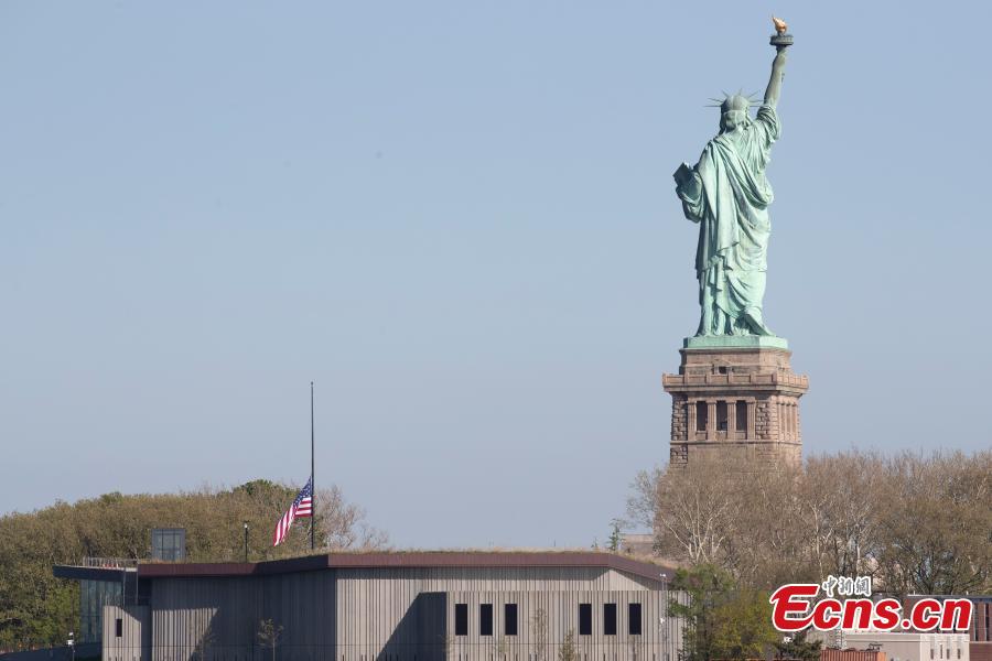 U.S. national flag flies at half-staff near the Statue of Liberty to mourn 1 million American lives lost to COVID-19, New York, U.S. May 12, 2022. U.S. President Joe Biden ordered U.S. flags to be flown at half-staff to mark the “tragic milestone” of 1 million COVID-19 deaths for five days. (Photo: China News Service/Liao Pan)