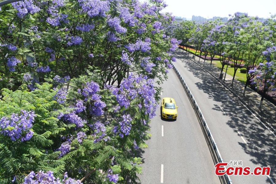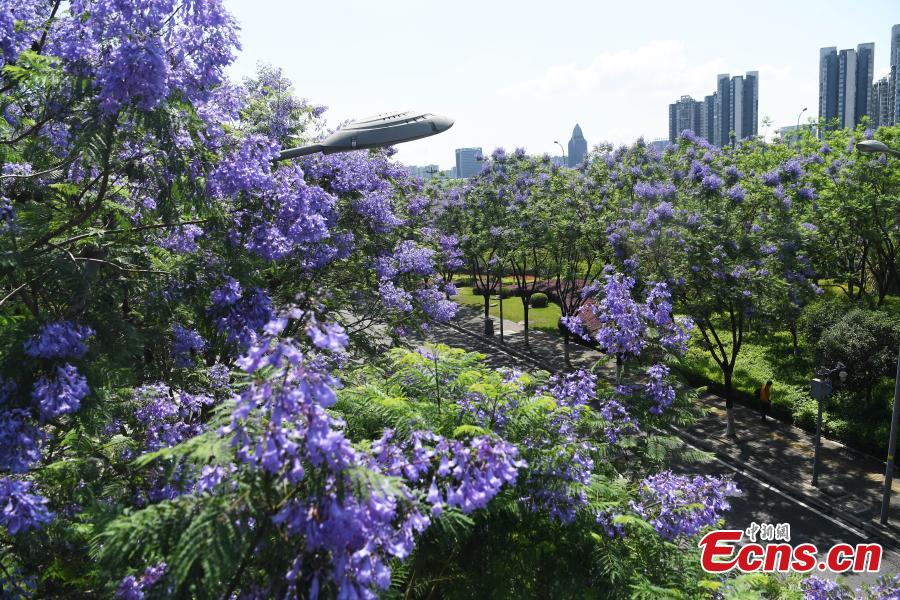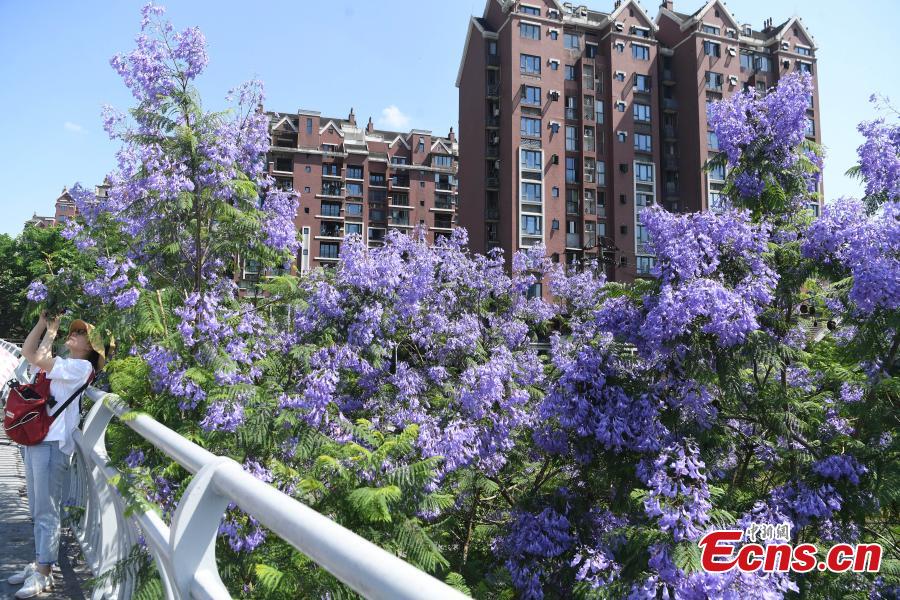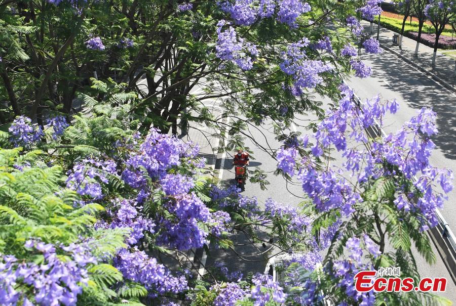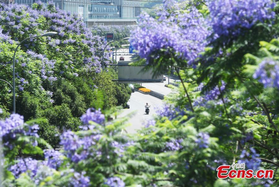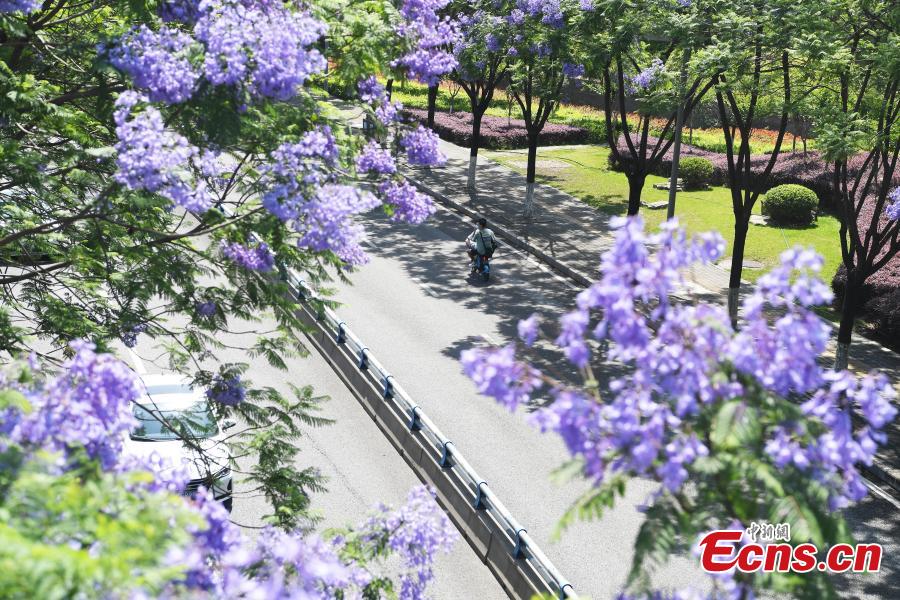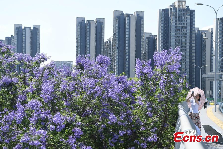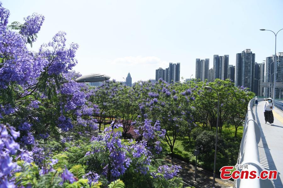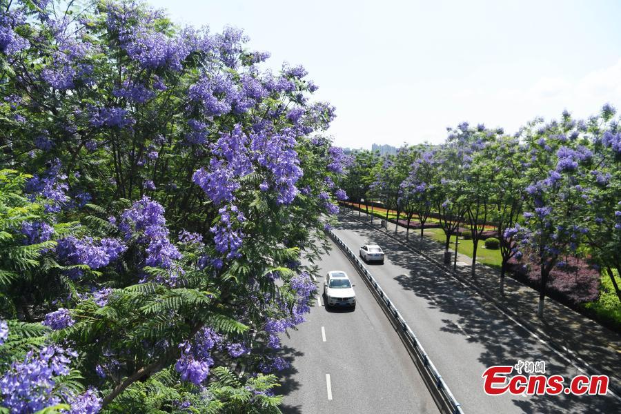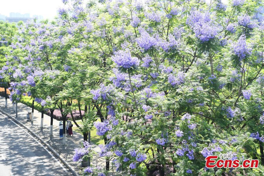 Gorgeous blue jacaranda trees are in full bloom along Lushan Ave., southwest China's Chongqing, May 13, 2022, attracting many visitors. (Photo: China News Service/Chen Chao)