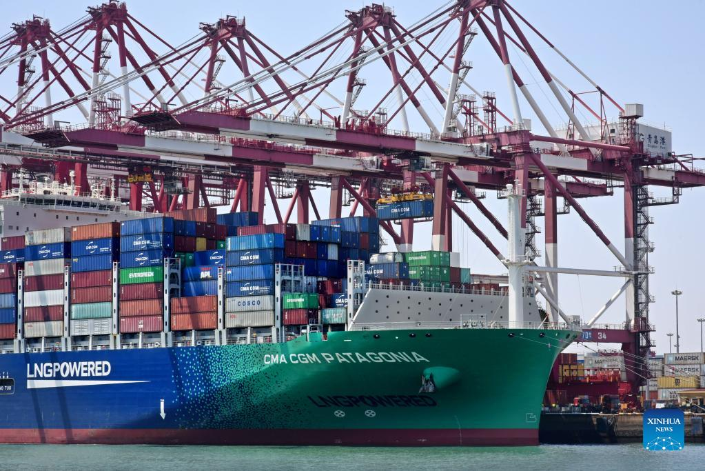 Photo taken on May 1, 2022 shows a container vessel docking at the Qianwan Container Terminal in Qingdao, east China's Shandong Province. East China's Shandong Province posted a 14.2 percent year-on-year increase in its foreign trade in the first four months of 2022, Qingdao Customs said on Thursday. (Xinhua/Li Ziheng)