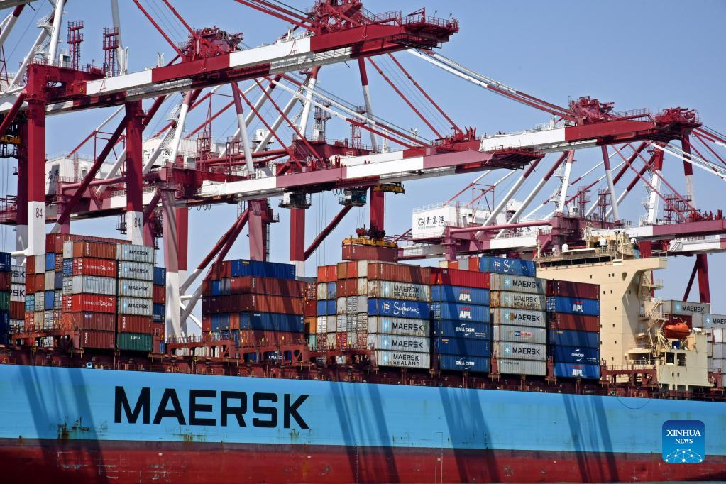 Photo taken on May 1, 2022 shows a container vessel docking at the Qianwan Container Terminal in Qingdao, east China's Shandong Province. East China's Shandong Province posted a 14.2 percent year-on-year increase in its foreign trade in the first four months of 2022, Qingdao Customs said on Thursday. (Xinhua/Li Ziheng)
