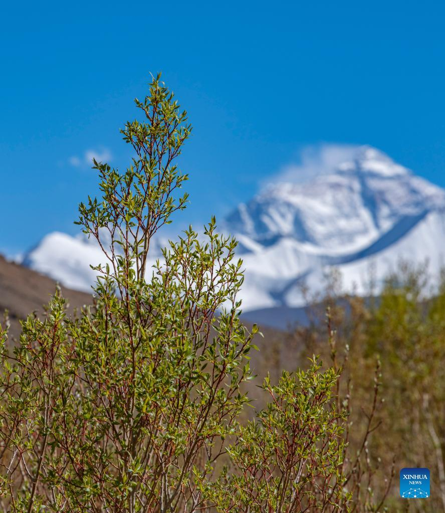 Photo taken on May 10, 2022 shows trees in the Qomolangma National Nature Reserve in Zhaxizom Township in Tingri County, southwest China's Tibet Autonomous Region. (Xinhua/Sun Fei)