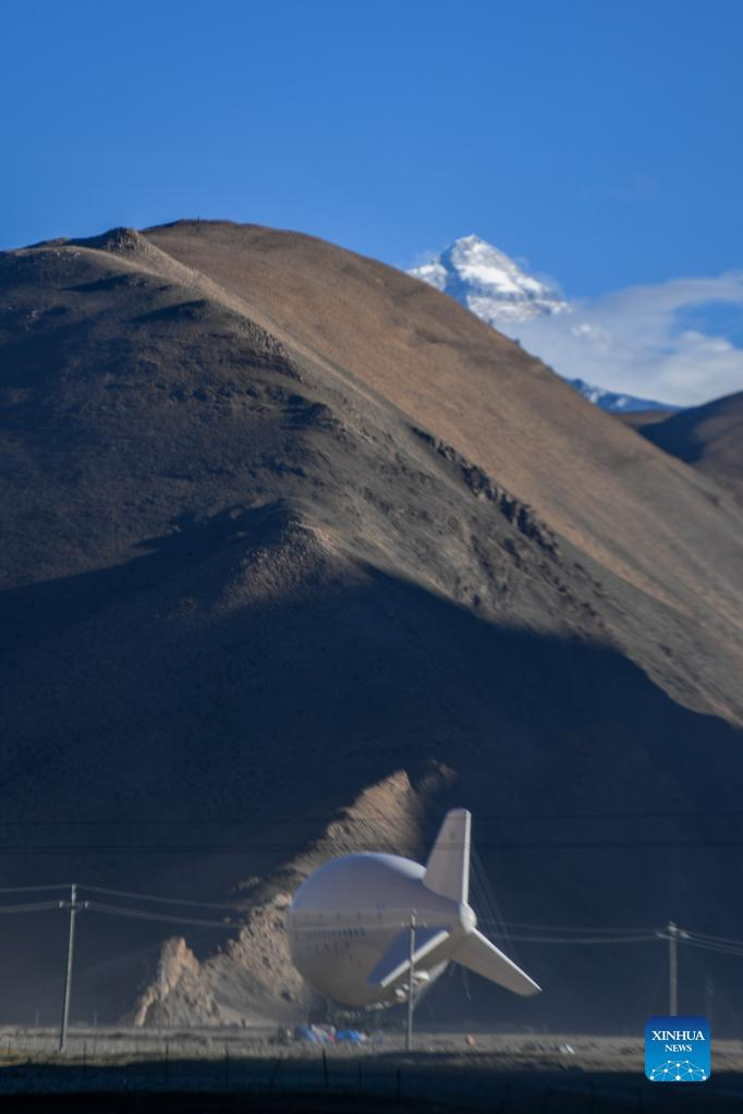 Photo taken on May 12, 2022 shows floating airship "Jimu No.1" type III in Zhaxizom Township of Tingri County, southwest China's Tibet Autonomous Region. China's self-developed floating airship, designed for atmosphere observation, reached a record altitude of 9,032 meters in Tibet Autonomous Region on Sunday, according to its developer. Developed by the Aerospace Information Research Institute of the Chinese Academy of Sciences (CAS), the floating airship "Jimu No.1" type III has a volume of 9,060 cubic meters. (Xinhua/Jiang Fan)