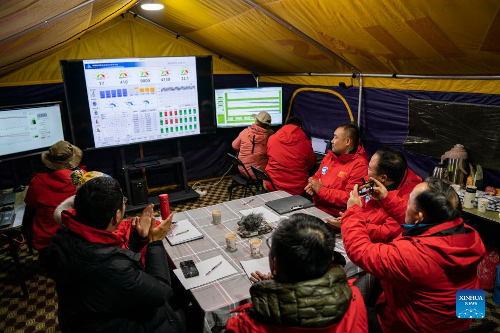 Scientific research members monitor the real-time statistics during the ascent of floating airship "Jimu No.1" type III in Zhaxizom Township of Tingri County, southwest China's Tibet Autonomous Region, May 15, 2022. China's self-developed floating airship, designed for atmosphere observation, reached a record altitude of 9,032 meters in Tibet Autonomous Region on Sunday, according to its developer. Developed by the Aerospace Information Research Institute of the Chinese Academy of Sciences (CAS), the floating airship "Jimu No.1" type III has a volume of 9,060 cubic meters. (Xinhua/Sun Fei)