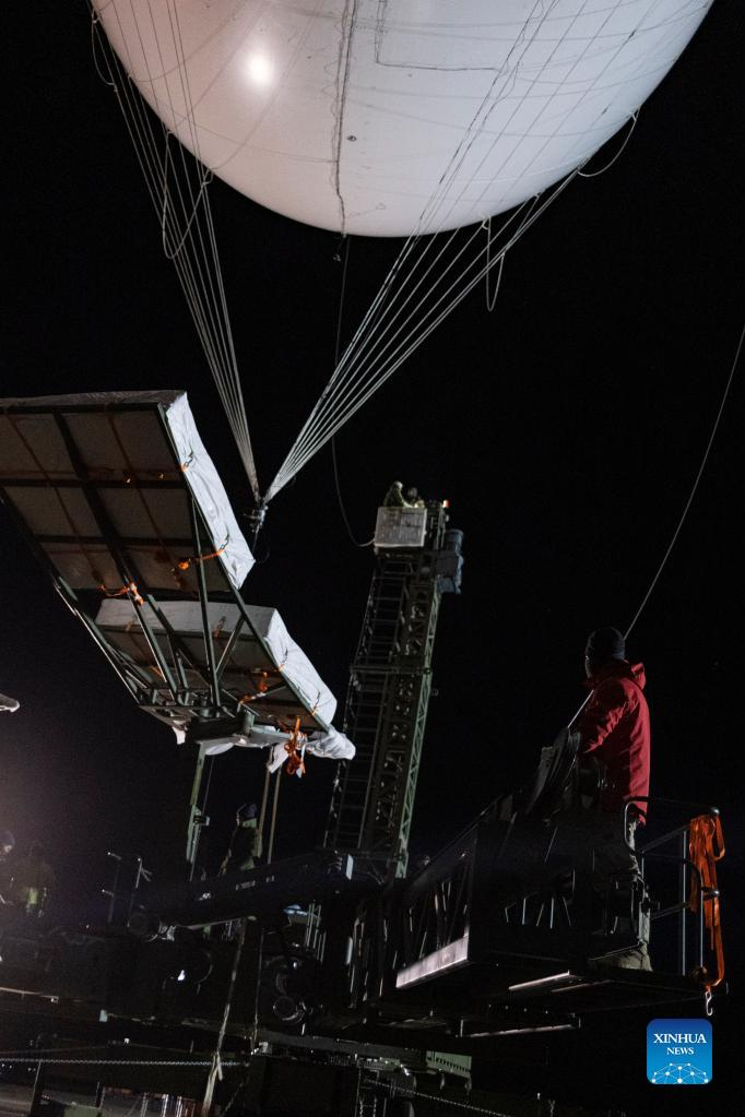 Floating airship "Jimu No.1" type III is being inflated in Zhaxizom Township of Tingri County, southwest China's Tibet Autonomous Region, May 12, 2022. China's self-developed floating airship, designed for atmosphere observation, reached a record altitude of 9,032 meters in Tibet Autonomous Region on Sunday, according to its developer. Developed by the Aerospace Information Research Institute of the Chinese Academy of Sciences (CAS), the floating airship "Jimu No.1" type III has a volume of 9,060 cubic meters. (Xinhua/Jiang Fan)