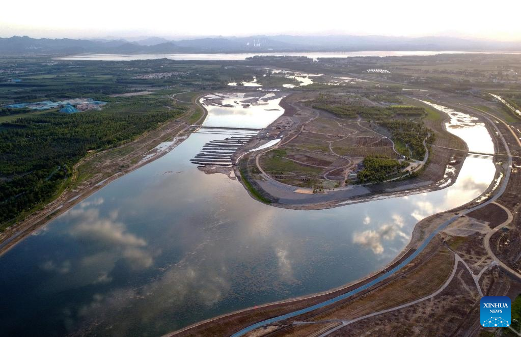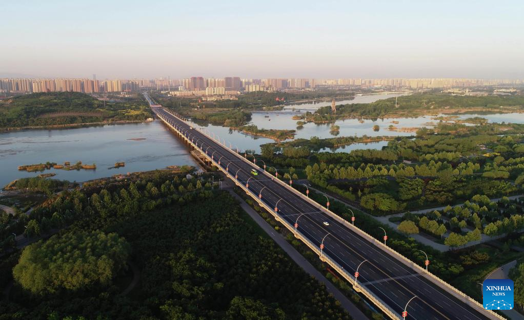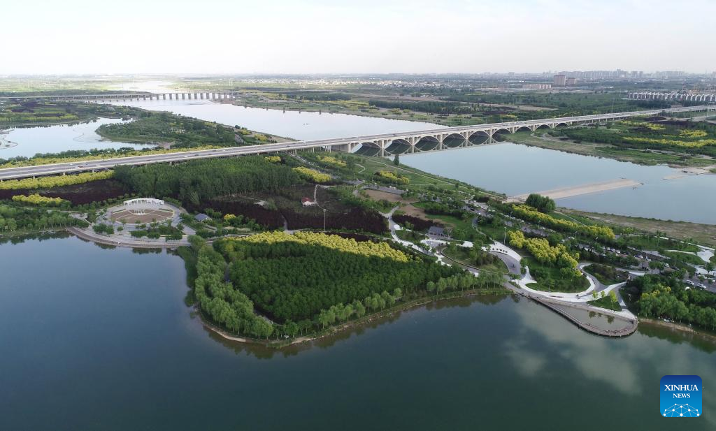 Aerial photo taken on May 15, 2022 shows the scenery of the Hutuo River in Shijiazhuang, north China's Hebei Province. With the ecological restoration project started in 2017, the Hutuo River has now become a new tourist attraction with picturesque sceneries. (Xinhua/Yang Shiyao)