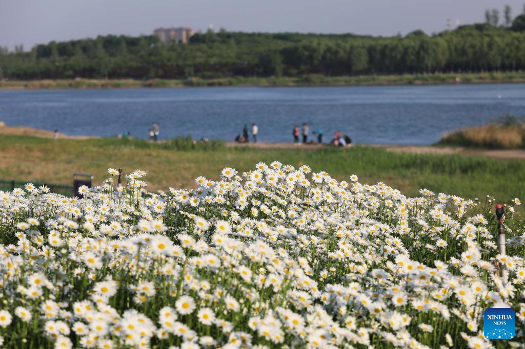 Visitors enjoy leisure time by the Hutuo River in Shijiazhuang, north China's Hebei Province, May 15, 2022. With the ecological restoration project started in 2017, the Hutuo River has now become a new tourist attraction with picturesque sceneries. (Xinhua/Yang Shiyao)