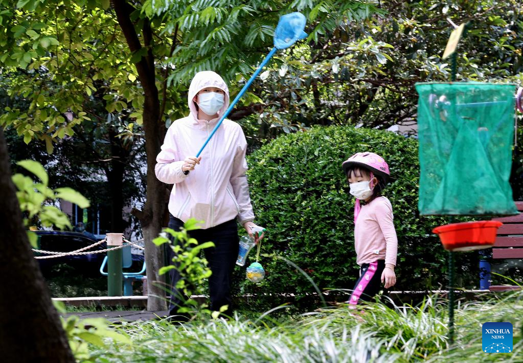 Residents are seen at a residential area in Putuo District of east China's Shanghai, May 16, 2022. China's Shanghai has cut off the community transmission of COVID-19 in 15 out of its 16 districts, according to a press conference on epidemic prevention and control held Monday. (Xinhua/Chen Fei)