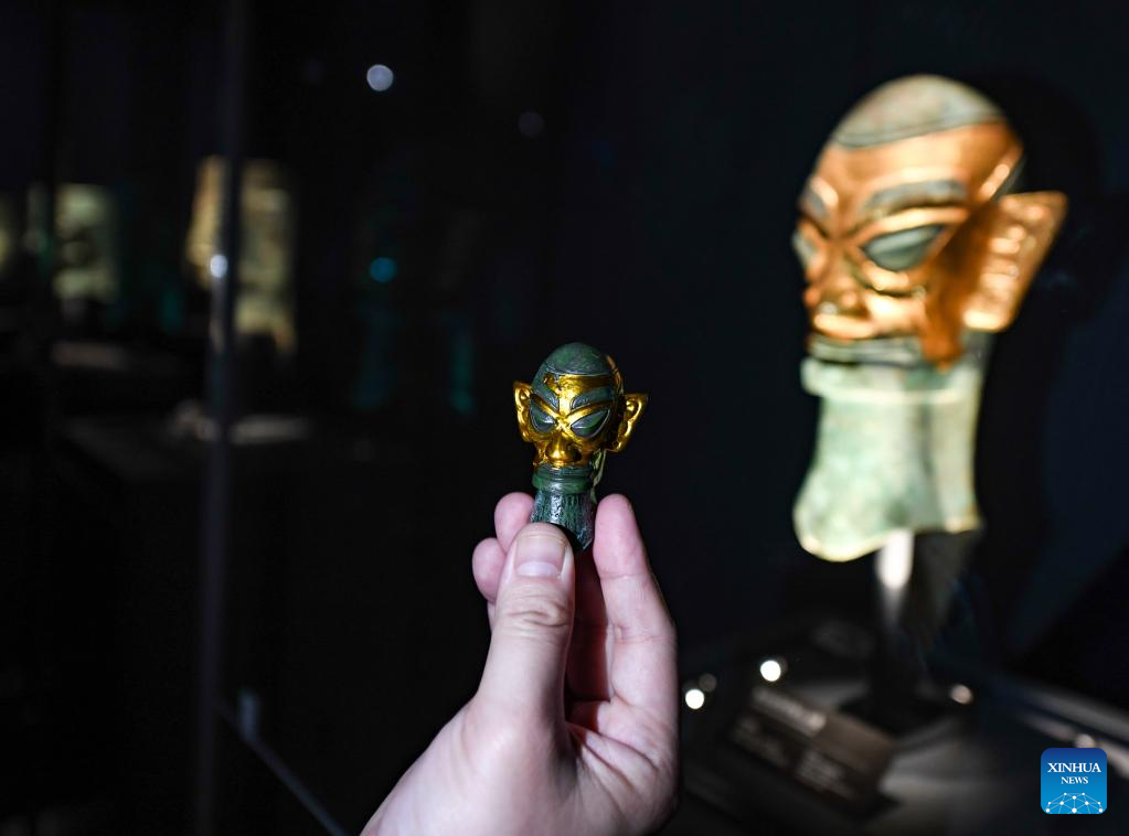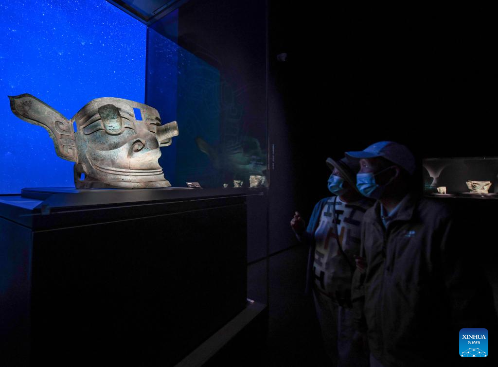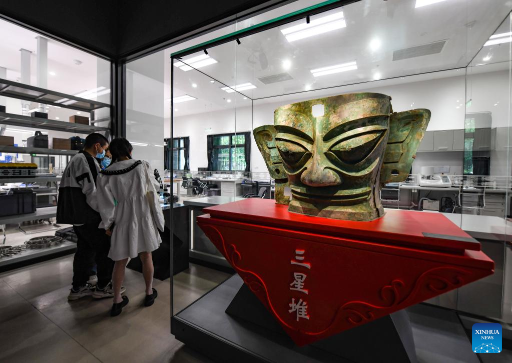 People visit the Sanxingdui Museum in Guanghan, southwest China's Sichuan Province, May 16, 2022. In recent years, important archaeological discoveries from Sanxingdui Ruins site have driven the boom of the designing and sales of cultural and creative products in the Sanxingdui Museum.