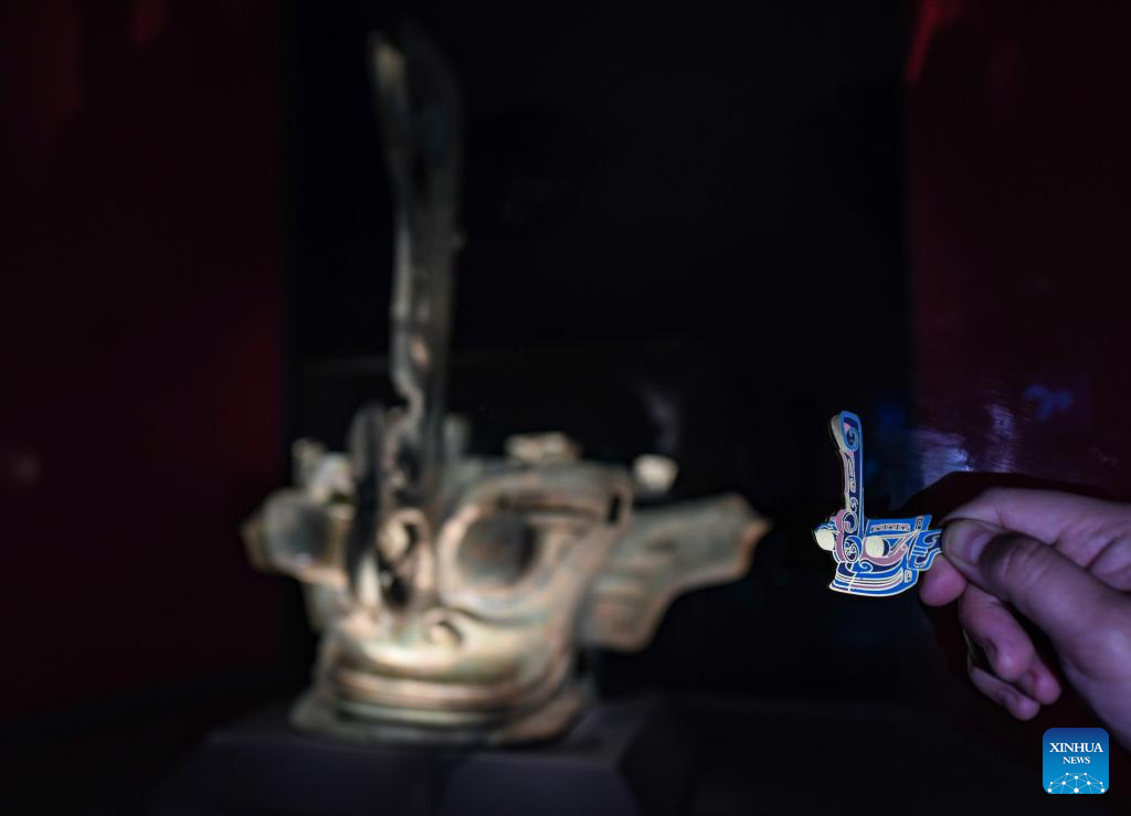 A fridge magnet in shape of a bronze ware is displayed in Sanxingdui Museum in Guanghan, southwest China's Sichuan Province, May 16, 2022. In recent years, important archaeological discoveries from Sanxingdui Ruins site have driven the boom of the designing and sales of cultural and creative products in the Sanxingdui Museum.