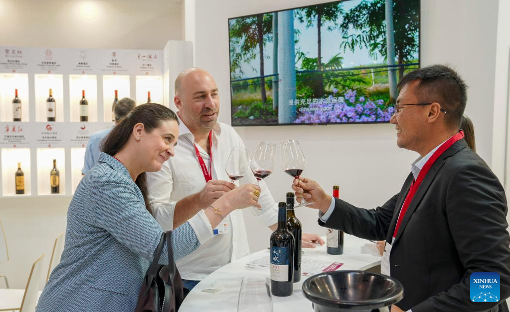 Visitors (L) taste the wine of the eastern Helan Mountain of China at the main venue of the ProWein 2022 in Dusseldorf, Germany, May 15, 2022. (Xinhua)