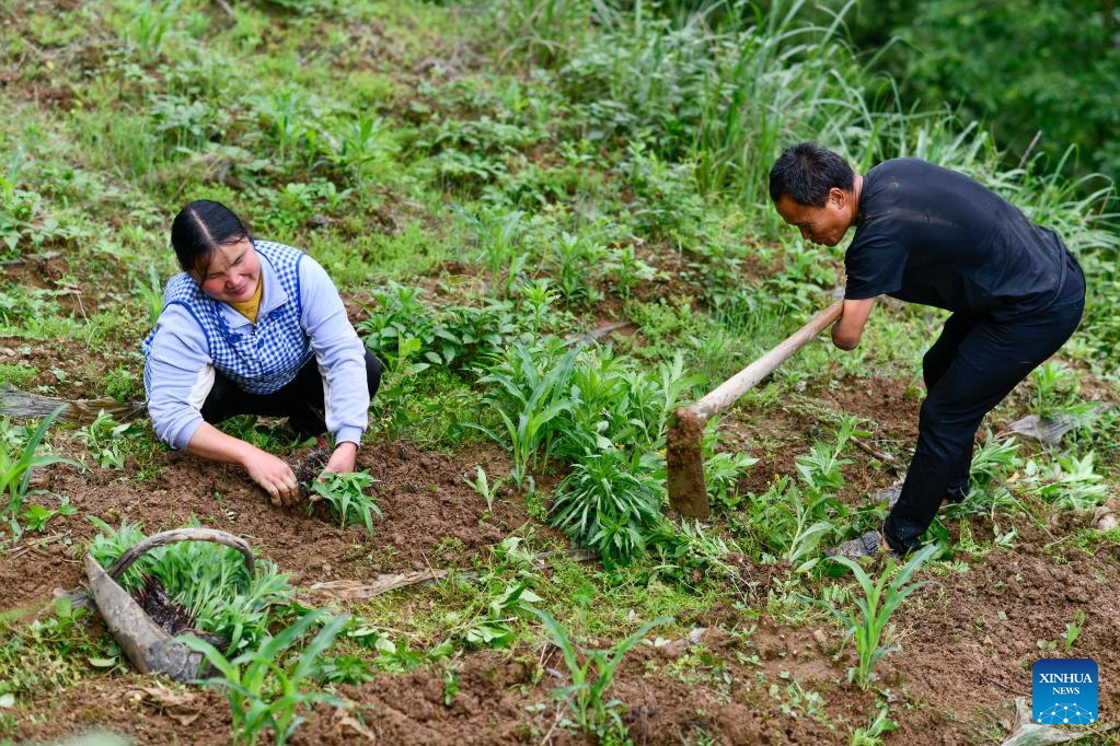 Zhao Youliang and Jian Qin transplant corn seedlings in the field in Zhongguan Township, Zheng'an County, southwest China's Guizhou Province, May 12, 2022. (Xinhua/Yang Wenbin)