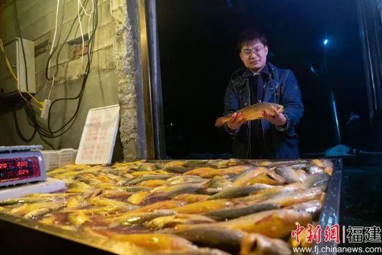 Ye Zhoumin shows large yellow croakers in his farm. (Photo/Chinanews.com)