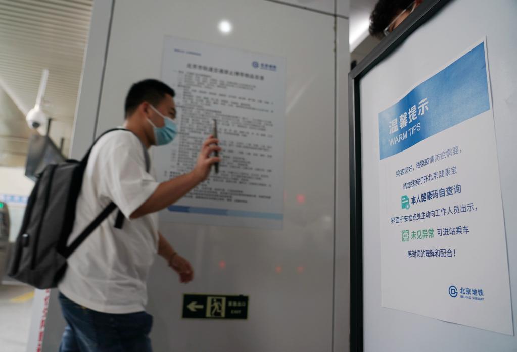 Passengers are required from Tuesday to have their health QR codes checked before taking public transport at some bus stops and subway stations near restrictive control areas and closed-off management areas in Beijing. (Xinhua/Zhang Chenlin)