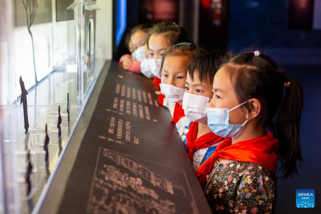 (220517) -- HAI'AN, May 17, 2022 (Xinhua) -- Students look at exhibits at a museum in Hai'an, east China's Jiangsu Province, May 17, 2022. The International Museum Day, which falls on May 18, is being celebrated with a variety of online and offline activities across China. (Photo by Zhai Huiyong/Xinhua)
