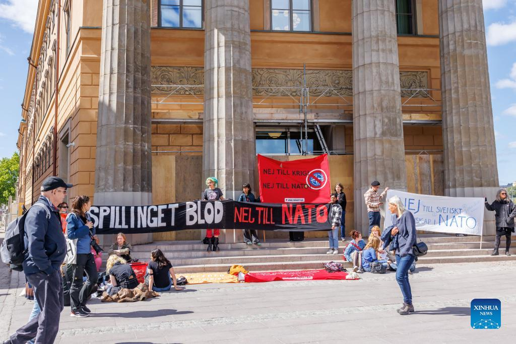 People protest against Sweden's decision to apply to join the North Atlantic Treaty Organization (NATO) in Stockholm, Sweden, May 16, 2022. Swedish Prime Minister Magdalena Andersson on Monday announced the official decision to start the process of the country's application to become a member of the NATO. (Photo by Wei Xuechao/Xinhua)