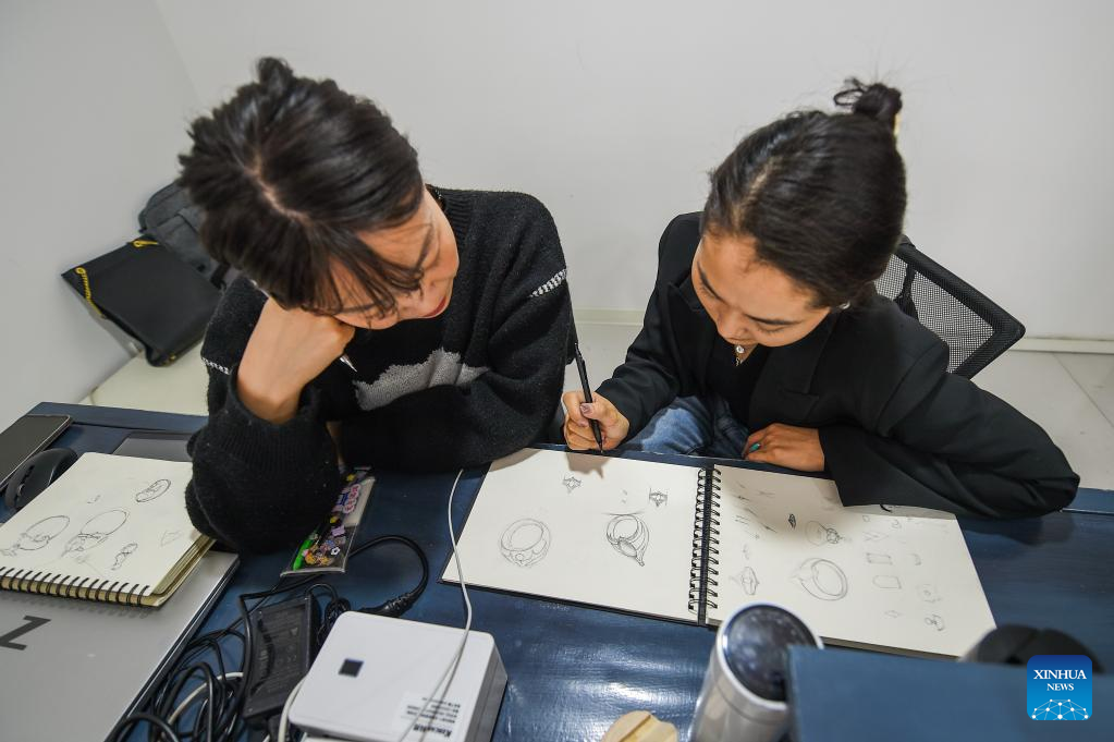 Tergel (R) and Zhang Aoyu talk about silver accessory design at a silver accessory shop in Xilinhot of Xilingol League, north China's Inner Mongolia Autonomous Region, May 16, 2022.