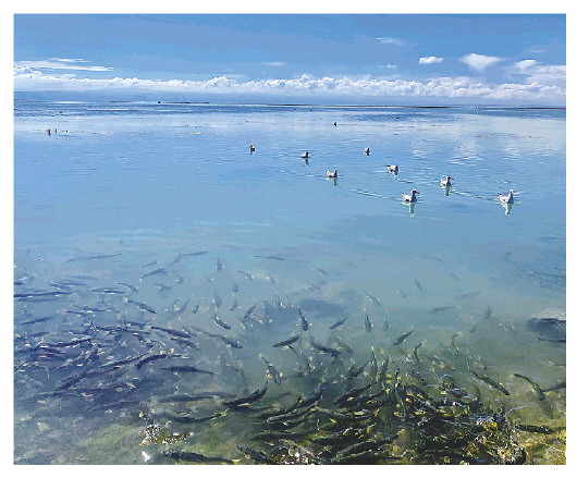 Photo taken on September 11, 2019, shows waterfowl and naked carp swimming in Qinghai Lake in northwest China’s Qinghai Province. (Xinhua/Li Linhai)