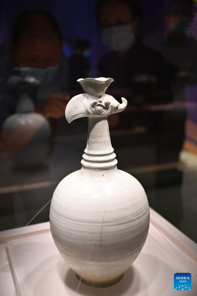 A phoenix head-shaped porcelain of the Song Dynasty (960-1279) is exhibited at Hainan Museum in Haikou, south China's Hainan Province, May 18, 2022.