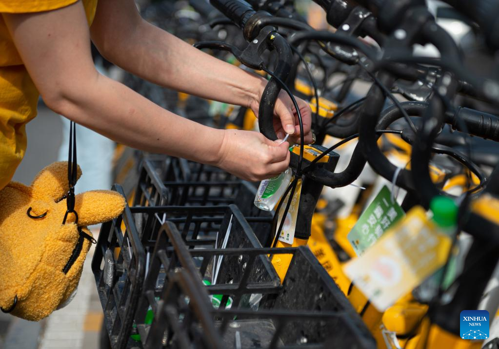 A bike-sharing service worker equips shared bikes with hand sanitizers outside a subway station in Beijing, capital of China, May 18, 2022. In Beijing, shared bikes have been disinfected and some of them are equipped with hand sanitizers recently as COVID-19 precaution measures, for the sake of the riders' health amid the recent COVID-19 resurgence. (Xinhua/Chen Zhonghao)