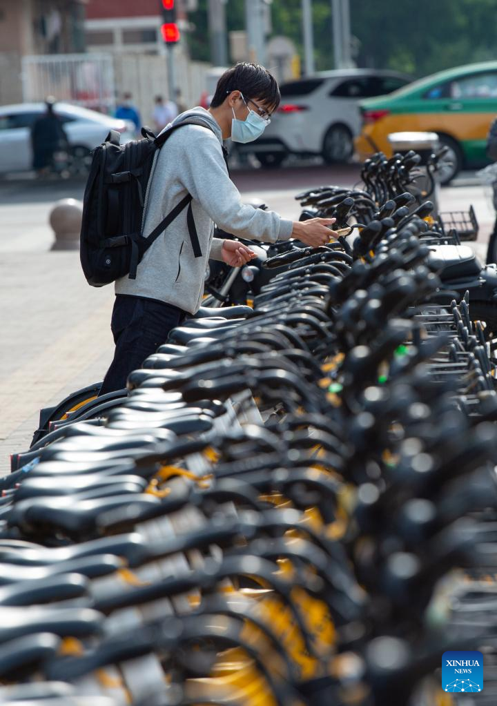 A man scans a QR code to unlock a shared bike outside a subway station in Beijing, capital of China, May 18, 2022. In Beijing, shared bikes have been disinfected and some of them are equipped with hand sanitizers recently as COVID-19 precaution measures, for the sake of the riders' health amid the recent COVID-19 resurgence. (Xinhua/Chen Zhonghao)