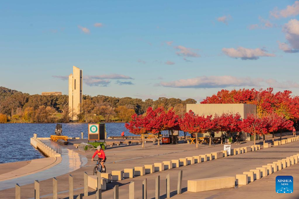 Photo taken on May 18, 2022 shows the autumn scenery by the Lake Burley Griffin in Canberra, Australia. (Photo by Chu Chen/Xinhua)