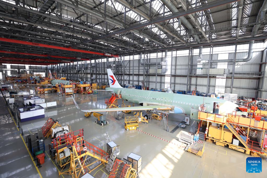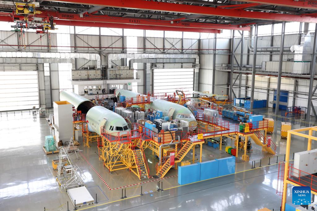 Staff members work at Airbus' Tianjin final assembly line for the A320-family of jets in north China's Tianjin, Feb. 24, 2022. Recent years Tianjin has been vigorously developing aerospace industry, boosting multiple industrial chains in a bid to promote high-quality development of the city. (Airbus China/Handout via Xinhua)