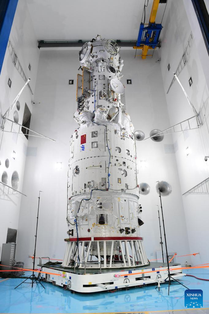 Undated file photo shows core module of China's space station Tianhe in noise test at a base of China Aerospace Science and Technology Corporation in north China's Tianjin. Recent years Tianjin has been vigorously developing aerospace industry, boosting multiple industrial chains in a bid to promote high-quality development of the city. (China Aerospace Science and Technology Corporation/Handout via Xinhua)