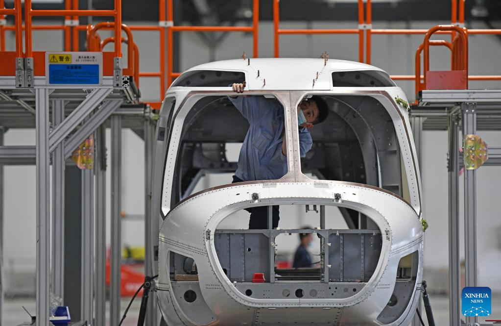 Staff members conduct riveting operation of an AC332 helicopter at a workshop of the Aviation Industry Corporation of China in north China's Tianjin, May 19, 2022. Recent years Tianjin has been vigorously developing aerospace industry, boosting multiple industrial chains in a bid to promote high-quality development of the city. (Xinhua/Zhao Zishuo)