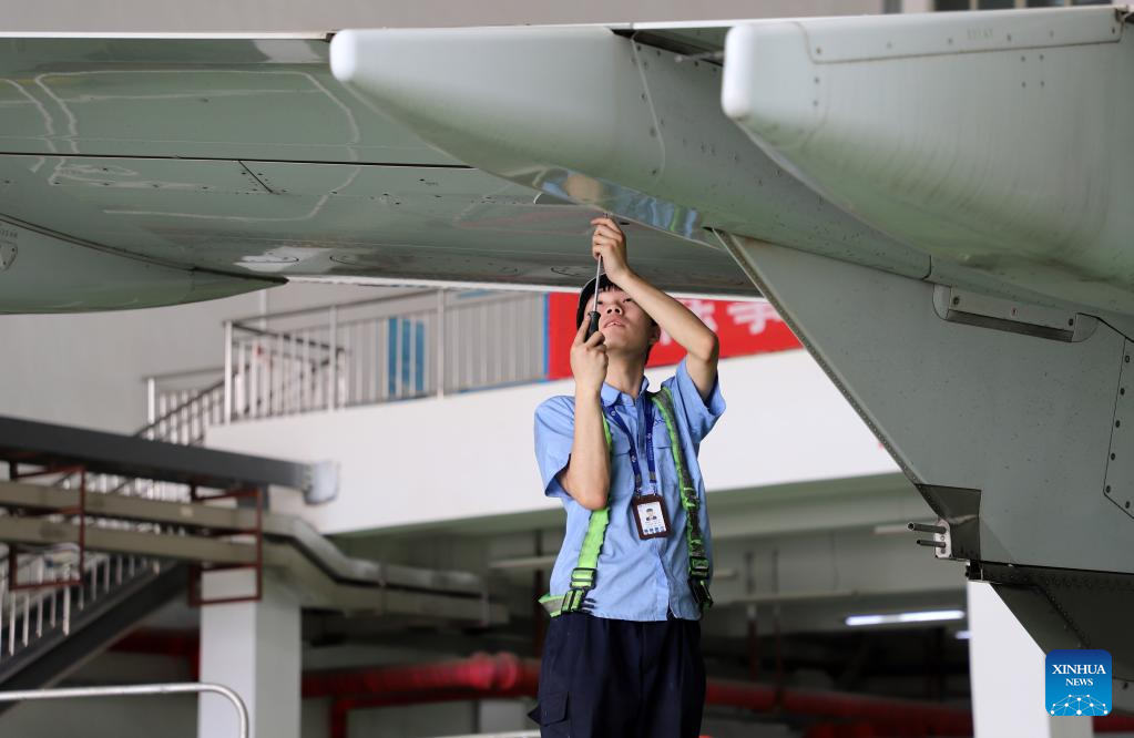 A worker maintains an airplane at a hangar in north China's Tianjin, May 18, 2022. Recent years Tianjin has been vigorously developing aerospace industry, boosting multiple industrial chains in a bid to promote high-quality development of the city. (Xinhua/Zhao Zishuo)