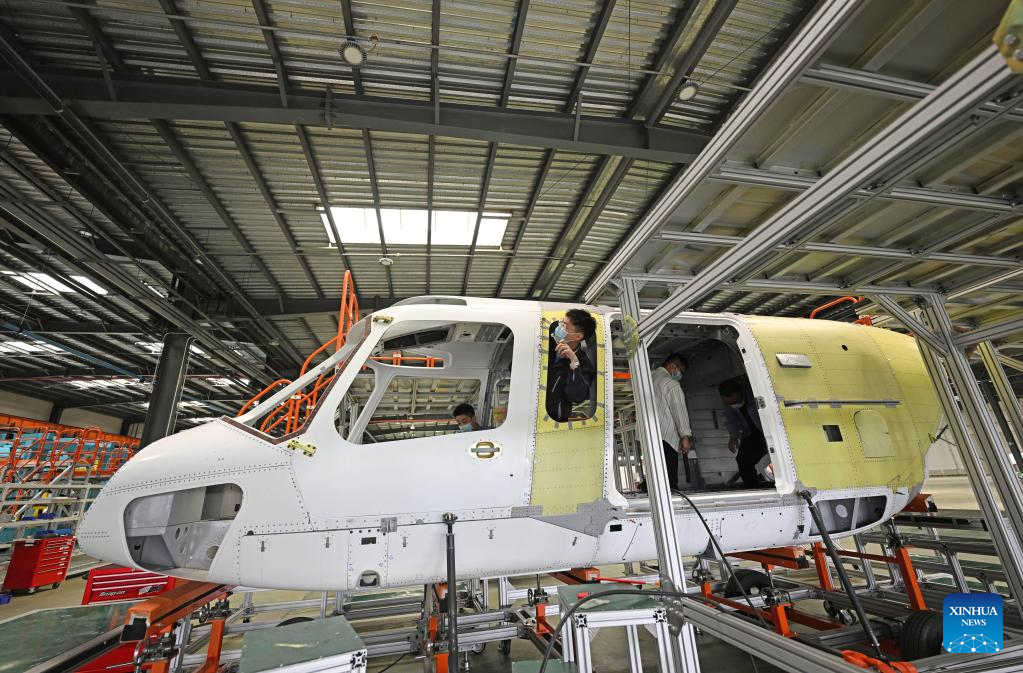 Staff members work on an AC312E helicopter at a workshop of the Aviation Industry Corporation of China in north China's Tianjin, May 19, 2022. Recent years Tianjin has been vigorously developing aerospace industry, boosting multiple industrial chains in a bid to promote high-quality development of the city. (Xinhua/Zhao Zishuo)