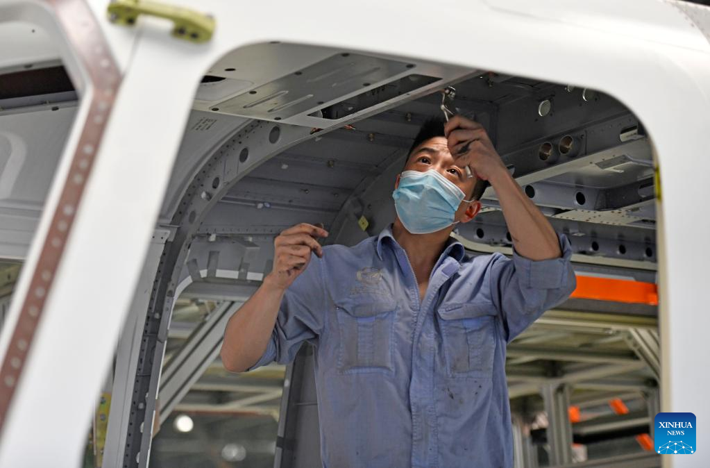 A staff member conducts riveting operation of an AC332 helicopter at a workshop of the Aviation Industry Corporation of China in north China's Tianjin, May 19, 2022. Recent years Tianjin has been vigorously developing aerospace industry, boosting multiple industrial chains in a bid to promote high-quality development of the city. (Xinhua/Zhao Zishuo)