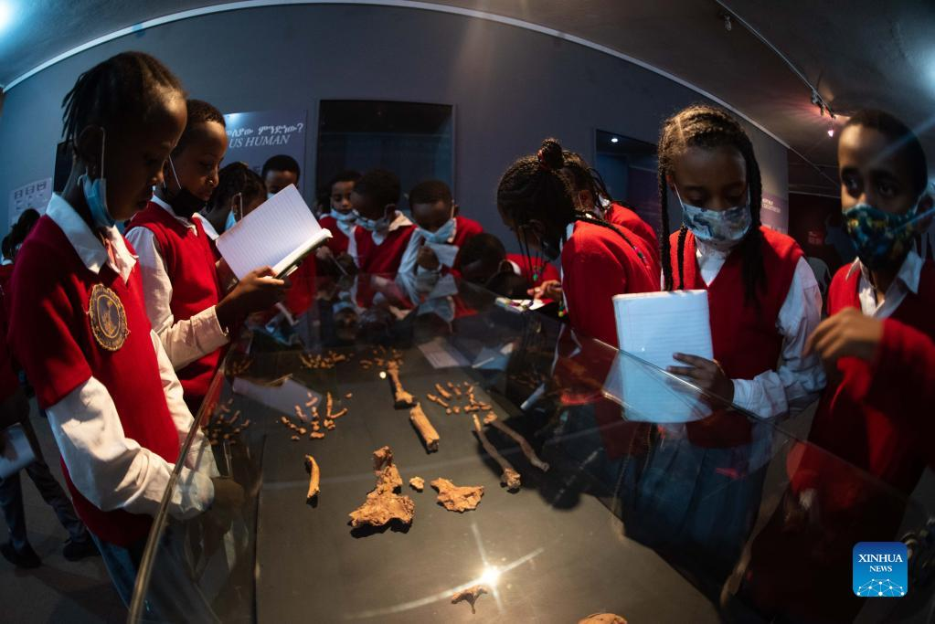 Students visit the National Museum of Ethiopia in Addis Ababa, Ethiopia, on May 18, 2022. The museum houses collections of precious heritages, including fossilized bones of a female of the hominin species Australopithecus afarensis, named "Lucy", which is believed to live about 3.2 million years ago. (Xinhua/Michael Tewelde)