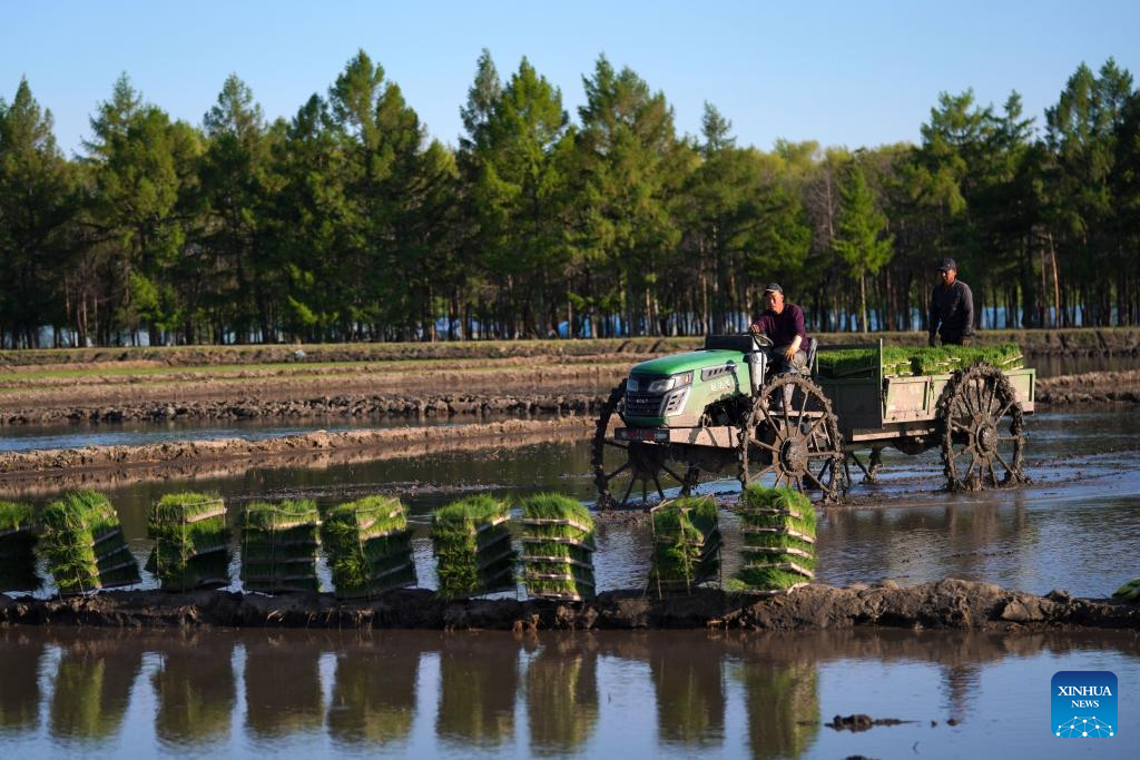 (220519) -- HARBIN, May 19, 2022 (Xinhua) -- Farmers transplant rice seedlings in a field in northeast China's Heilongjiang Province, May 18, 2022. Spring farming activities are in full swing across Heilongjiang Province. By May 17, the province's spring sowing area of crops has reached 190 million mu (about 12.67 million hectares). (Xinhua/Wang Jianwei)