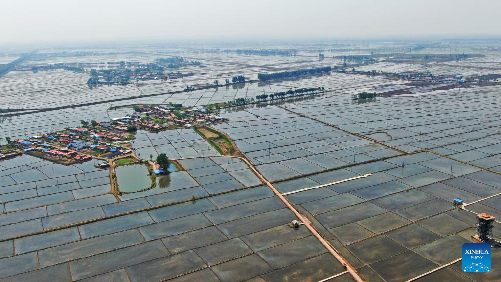 Aerial photo taken on May 18, 2022 shows paddy fields in Shenbei New District of Shenyang, northeast China's Liaoning Province. Liaoning has stepped up efforts on farming activities as the temperature rises recently. By May 17, the province's spring sowing area of crops has reached 48,645,000 mu (3,243,000 hectares). (Xinhua/Yang Qing)