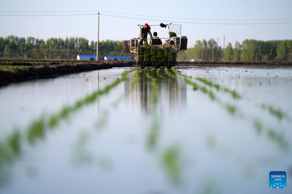Farmers transplant rice seedlings in a field in northeast China's Heilongjiang Province, May 18, 2022. Spring farming activities are in full swing across Heilongjiang Province. By May 17, the province's spring sowing area of crops has reached 190 million mu (about 12.67 million hectares). (Xinhua/Wang Jianwei)