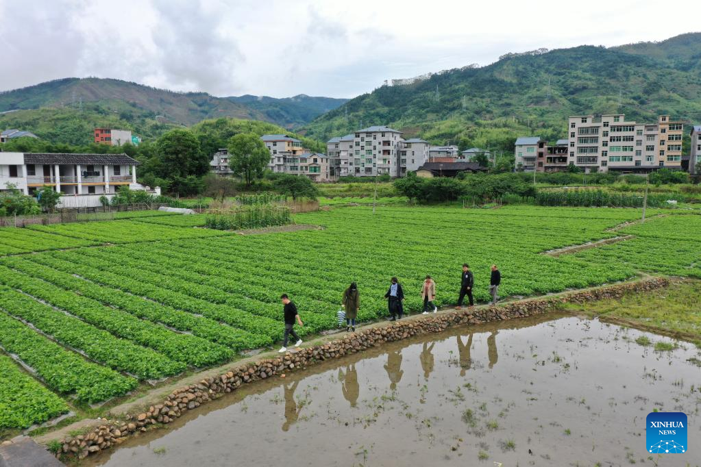 Aerial photo shows Chan Chun-Chieh (2nd R) learning the growing situation of peanuts in Changqing Town of Yongtai County, southeast China's Fujian Province, May 16, 2022. (Xinhua/Jiang Kehong)