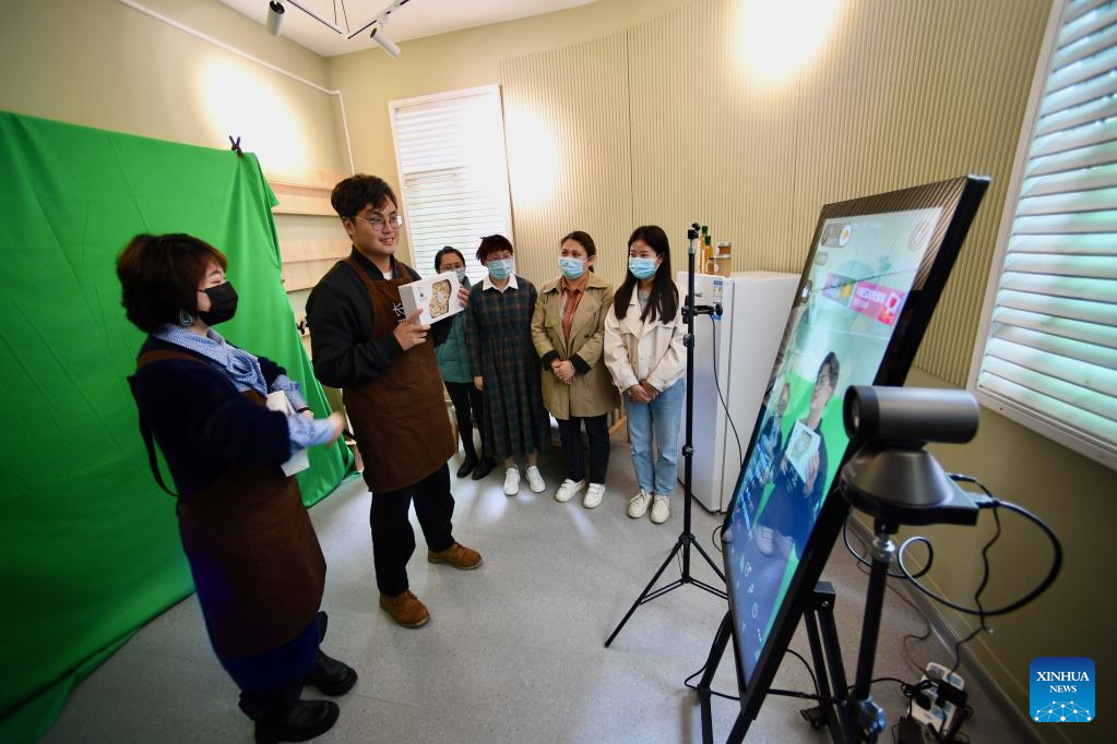 Chan Chun-Chieh (2nd L) demonstrates how to sell products via livestreaming in Changqing Town of Yongtai County, southeast China's Fujian Province, May 16, 2022. (Xinhua/Jiang Kehong)