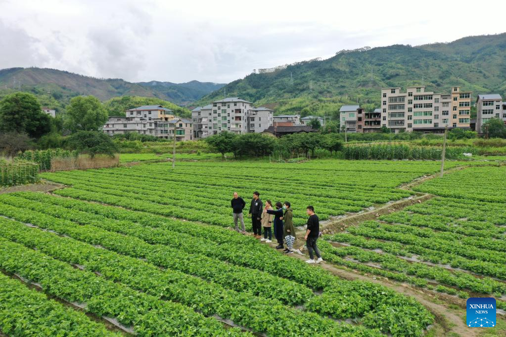 Aerial photo shows Chan Chun-Chieh (2nd L) learning the growing situation of peanuts in Changqing Town of Yongtai County, southeast China's Fujian Province, May 16, 2022. (Xinhua/Jiang Kehong)