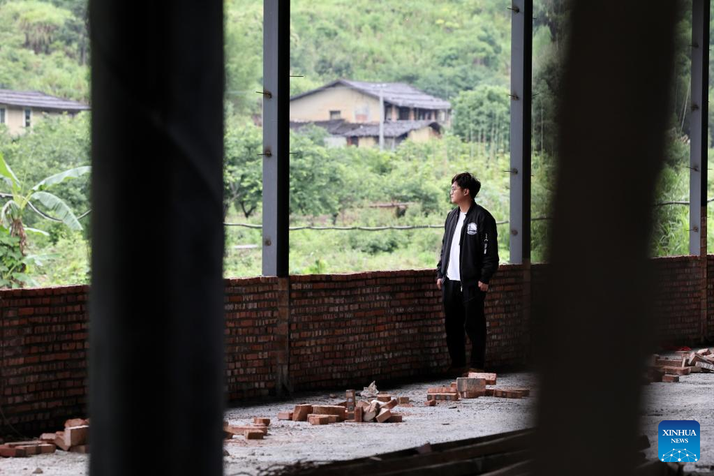 Chan Chun-Chieh checks the construction progress of the factory he designed in Changqing Town of Yongtai County, southeast China's Fujian Province, May 16, 2022. (Xinhua/Jiang Kehong)
