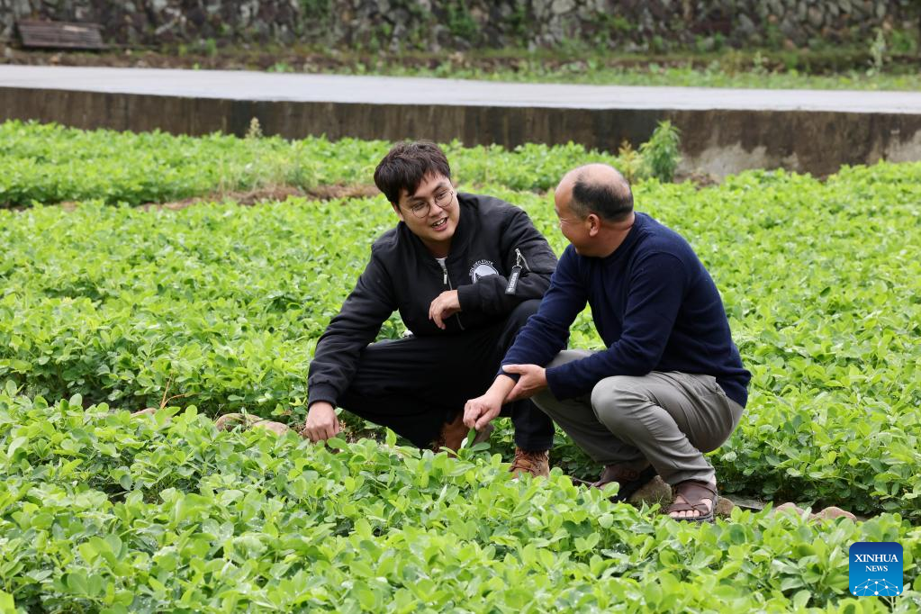 Chan Chun-Chieh (L) learns the growing situation of peanuts in Changqing Town of Yongtai County, southeast China's Fujian Province, May 16, 2022. (Xinhua/Jiang Kehong)