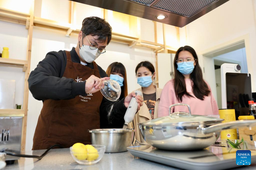 Chan Chun-Chieh (L) makes food in Changqing Town of Yongtai County, southeast China's Fujian Province, May 16, 2022. (Xinhua/Jiang Kehong)