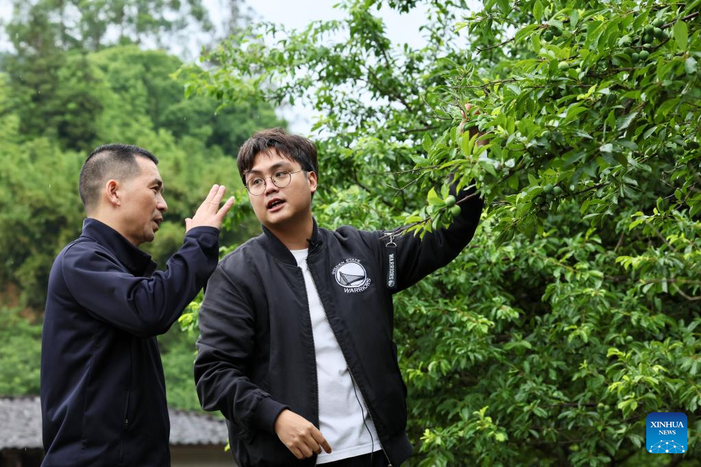 Chan Chun-Chieh (R) learns the growing situation of plums in Changqing Town of Yongtai County, southeast China's Fujian Province, May 16, 2022. Chan Chun-Chien, a Taiwanese architect born in the 1990s, became attached to the countryside in Fujian in 2019. Inspired by China's rural revitalization efforts, he came to Changqing town and converted a local agricultural technology station into a comprehensive platform featuring agricultural products display and e-commerce training. Taking advantage of the platform, Chan took a step forward and established the "Changqing Select" brand to promote the development of local characteristic industries related to peanuts, plums, honey, and bamboo.